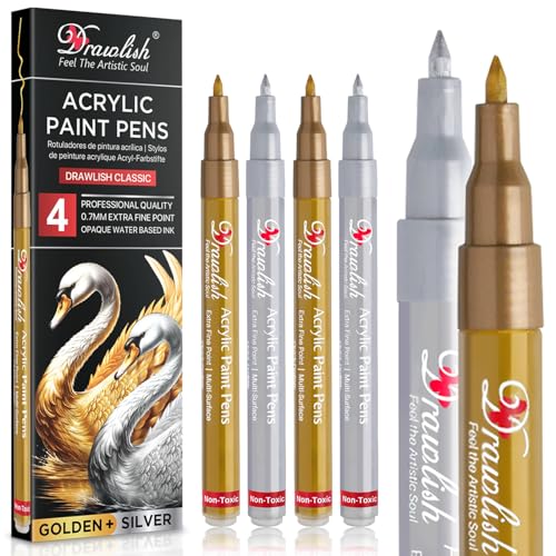 Acrylic Paint Pens - Metallic Marker Pens 2 Gold & 2 Silver Acrylic Pen - Set of 4 Paint Markers 0.7mm Extra Fine Tip - Ideal for Fabric, Glass, Wood, Canvas, Ceramic, Porcelain, Rock Painting