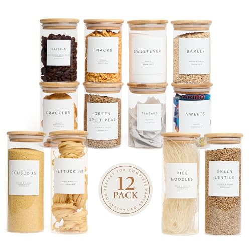 Livabl Glass Storage Containers with Lids – Set of 12 (8 x 600ml & 4 x 1000ml) Glass Jars with Lids Bamboo & 420 Pre-Printed Pantry Labels – Kitchen Storage Containers for Organising Pantry Essentials