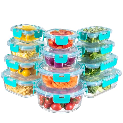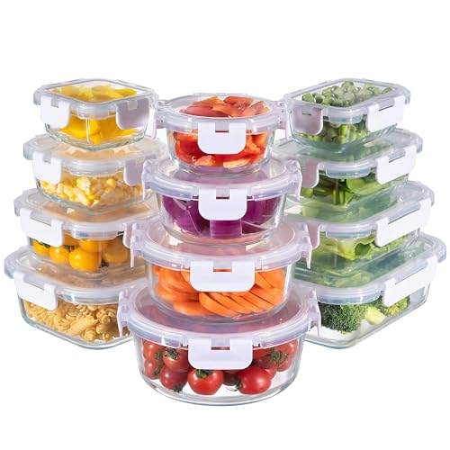 KICHLY Glass meal prep containers - Set of 24pcs (12 Containers and 12 Lids) - Airtight Storage glass food containers with lids for Freezer - Snap locking, Dishwasher safe, Oven Friendly, & BPA Free