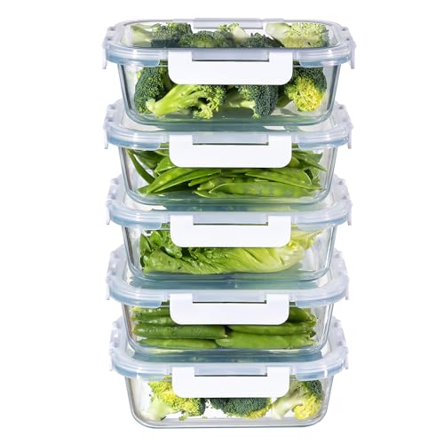 MFY 5 Pack 36oz Glass Containers with Lids, Reusable Meal Prep Containers, Airtight Glass Food Storage Containers with Lids, BPA-free, Microwave, Oven, Freezer & Dishwasher Safe, White