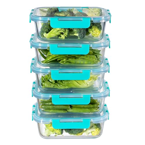 MFY 5 Pack 36oz Glass Containers with Lids, Reusable Meal Prep Containers, Airtight Glass Food Storage Containers with Lids, BPA-free, Microwave, Oven, Freezer & Dishwasher Safe, Green