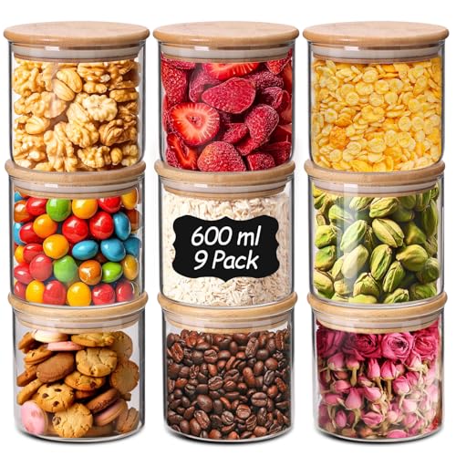 ComSaf 600ml Glass Food Storage Jars Set of 9, Clear Glass Storage Containers with Bamboo Lids, Pantry Organization Jar, Spice, Blooming Tea, Coffee and Sugar Container, Small Canister Set for Kitchen