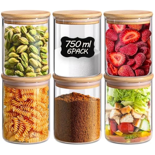 ComSaf 750ml Glass Food Storage Jars Set of 6, Clear Glass Storage Containers with Bamboo Lids, Pantry Organization Jar, Spice, Tea, Coffee and Sugar Container, Small Canister Set for Kitchen