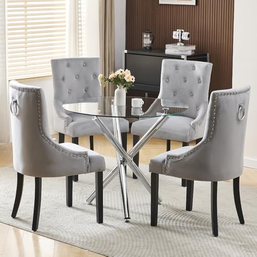 BonChoice Modern Round Glass Dining Table and Chairs Set 4, 5 Piece Round Dining Room Table Set, Glass Table with Knocker Dining Chairs Space Saving (5Pcs:Table+4 Grey Knocker Chair)