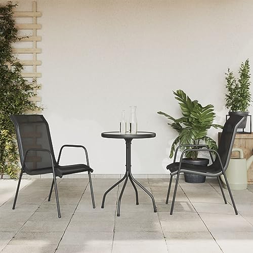Bucmath 3-Piece Garden Dining Set, Black Steel, Weatherproof Textilene, Round Glass Table, 2 Chairs with Armrests for Balcony, Patio, Outdoor Furniture Set