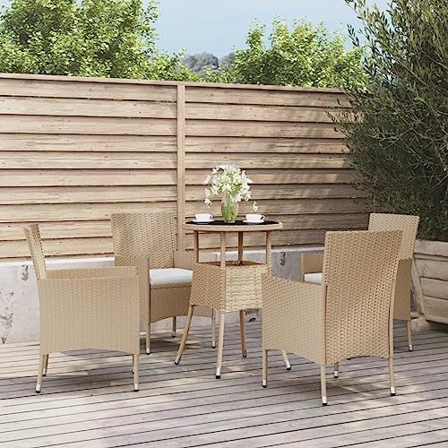 Teenpull 5-Piece Garden Bistro Set, Beige Poly Rattan, Diameter 60 cm, Glass Table, 4 Chairs with Cushions, Outdoor Furniture for Balcony, Patio, Garden