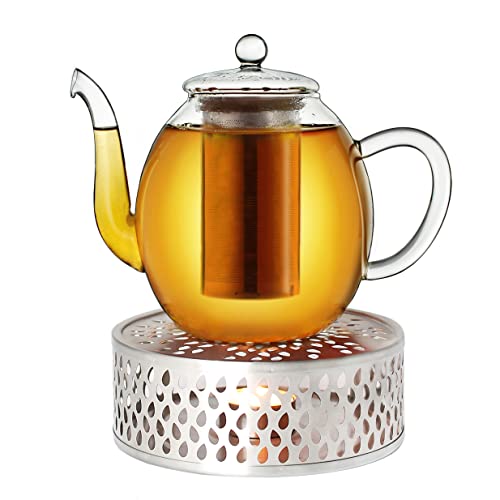 Creano Glass Teapot 1000ml with Warmer - Stovetop Safe Tea Kettle with Stainless Steel Infuser and Glass Lid, Ideal for Preparing Loose Teas - Drip Free