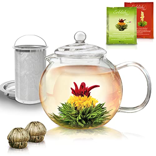 Creano Glass Teapot 1300ml - Including 2 Blooming Tea - Stovetop Safe Tea Kettle with Stainless Steel Infuser and Glass Lid - Ideal for Preparing Loose Teas - Drip Free