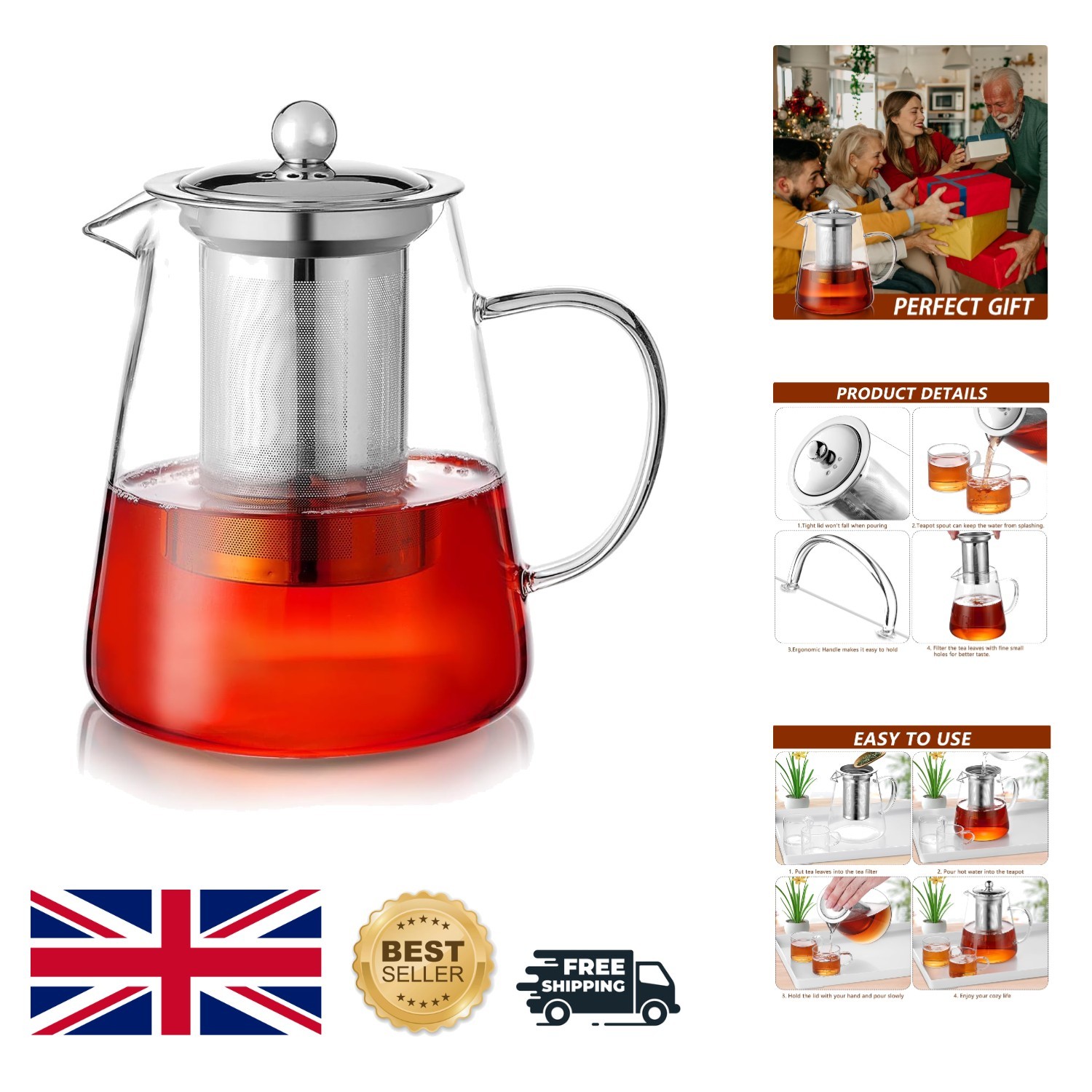 2L Glass Teapot with Infuser, Heat-Resistant Borosilicate Glass, Tea Pot Infuser