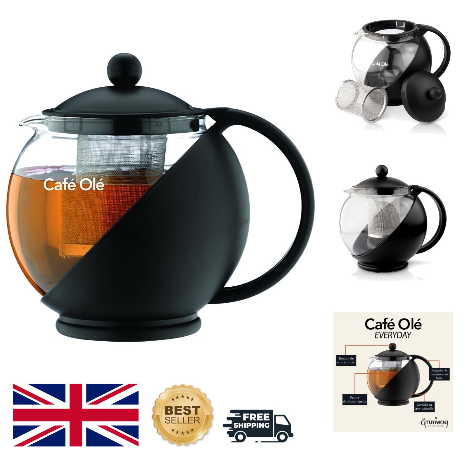 Heat Resistant Café Ole Round Glass Infuser Teapot - 700ml Loose Leaf Essential