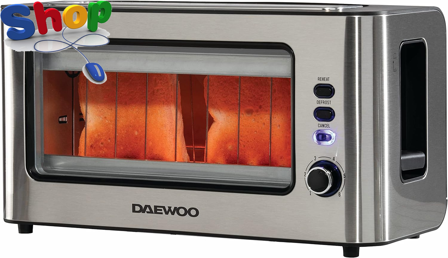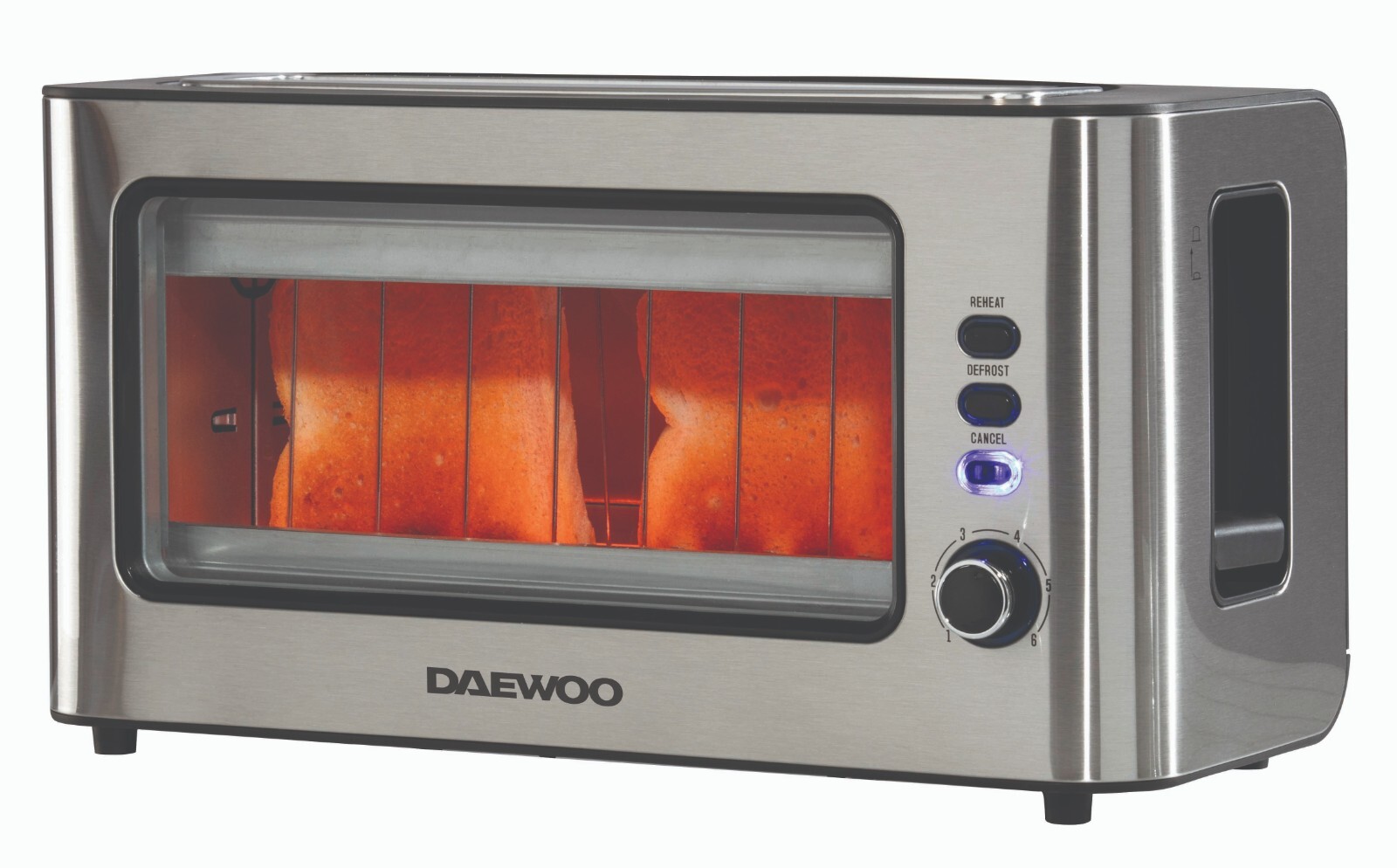 Daewoo 2 Slice Toaster Glass Front Wide Slot Defrost Reheat Function 900W