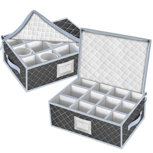 VERONLY Mug and Cup Storage Box with Dividers - 2 Pack China Storage Bin Containers Holds 24 Glassware, Stackable Coffee Mug Organizer Bin and Tea Cup with 2 Metal Zipper,Label and Handles (Grey)