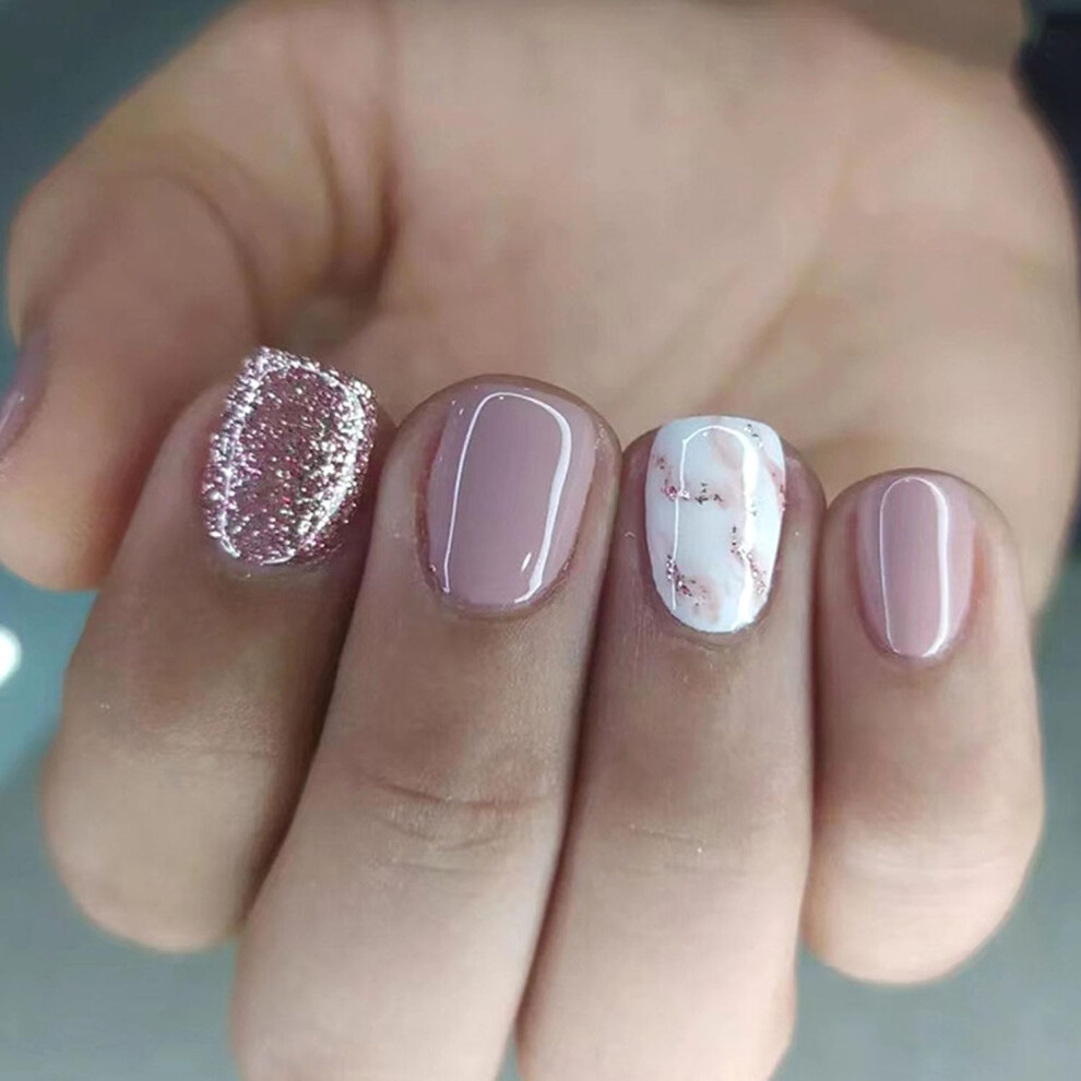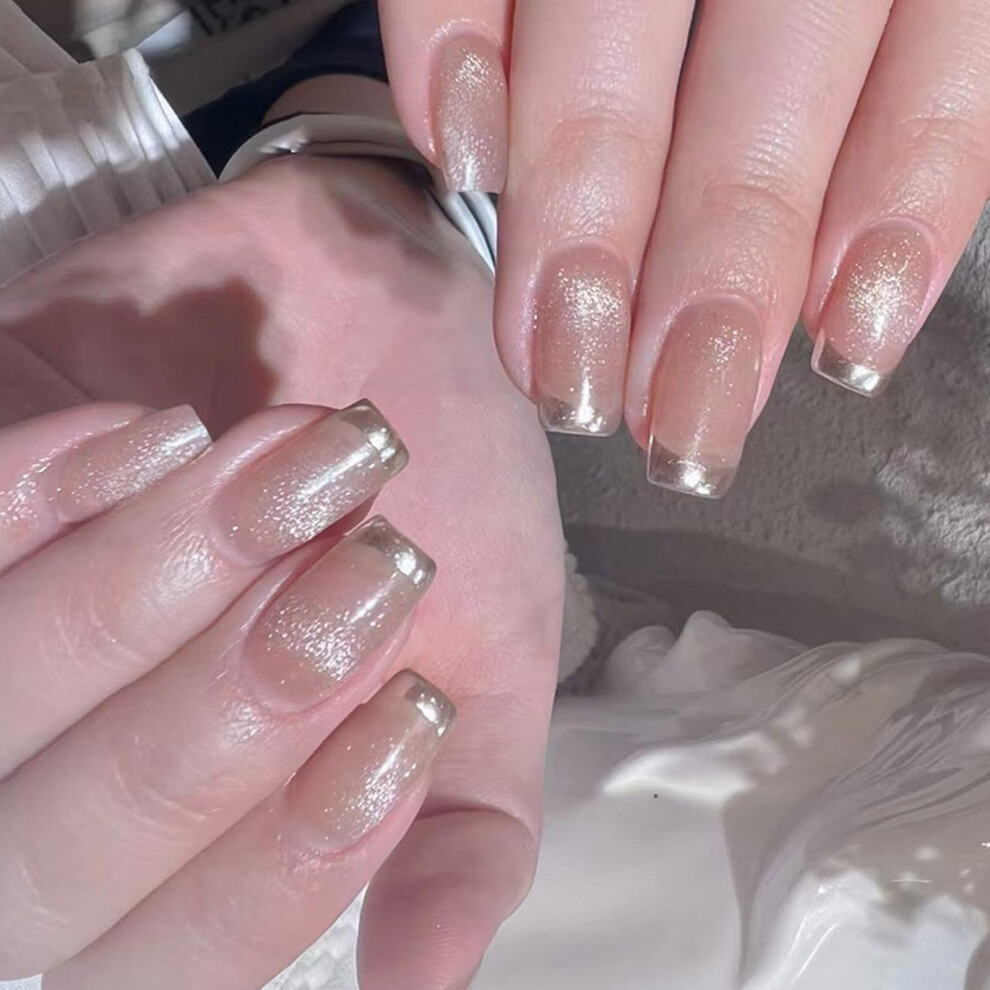 Light Pink Square Press On Nails Kit with Glue, Glitter Acrylic Fake Nails for Women 24 Pcs