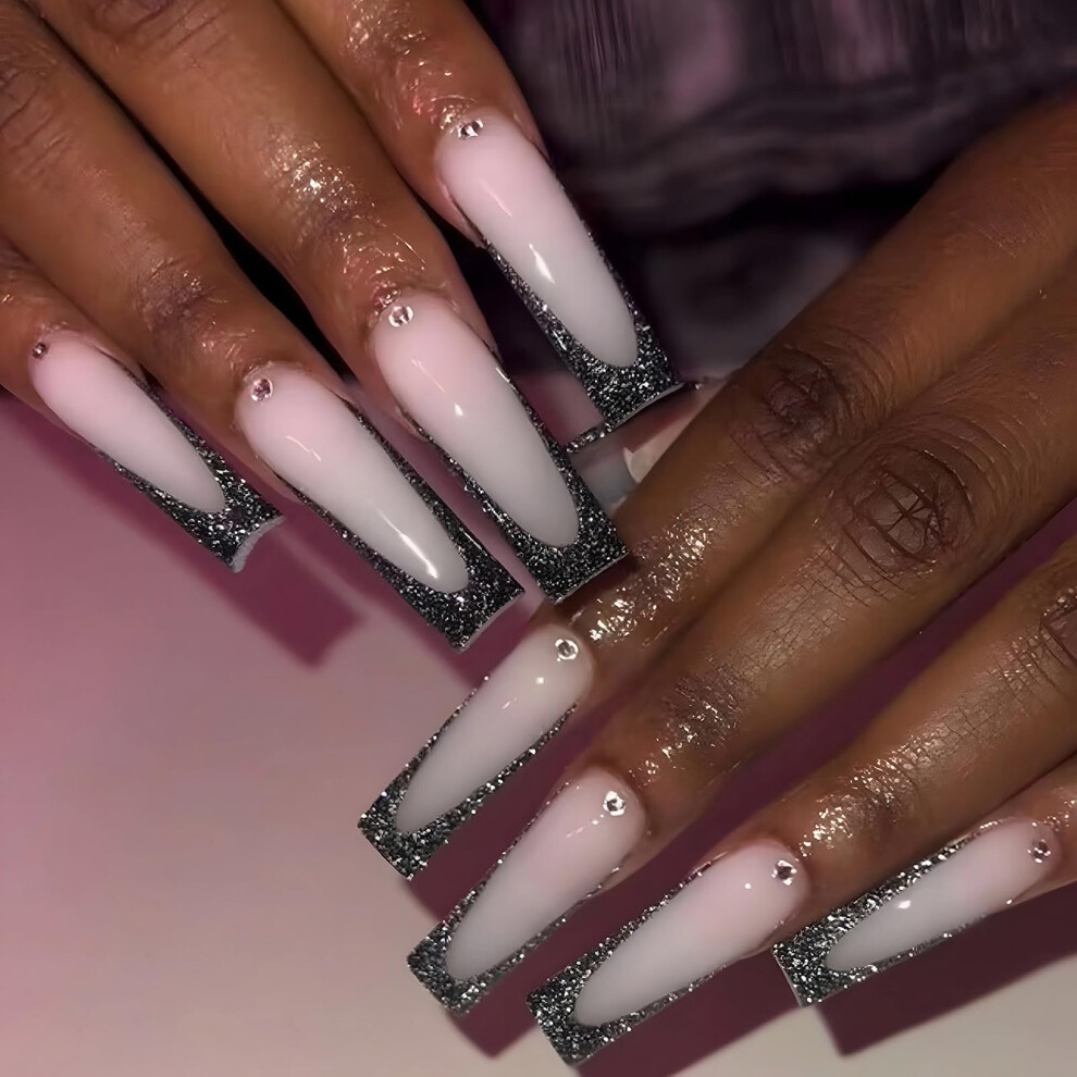 Long Square Press On Nails with Black French Tip and Bling Glitter, 24pcs Acrylic Fake Nails