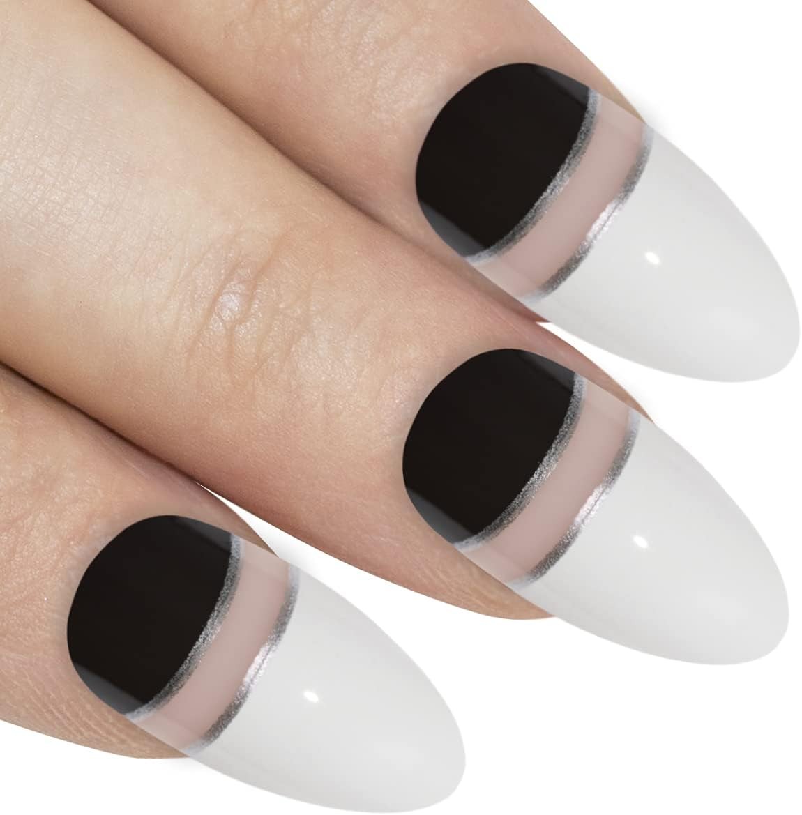 Almond False Nails Fake Stiletto Gel Glitter Glossy Acrylic Long 24 Tips Glue (Black White Glossy)