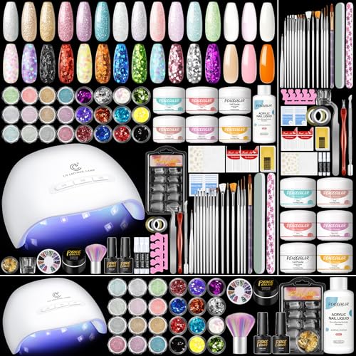 PEACECOLOR 74Pcs Acrylic Nail Kit with Lamp,6 Colours Acrylic Powder and Liquid, 24Pcs Glitter Powder Top Coat Base Coat False Nails Brush Nail Art Tools Kit for Beginners