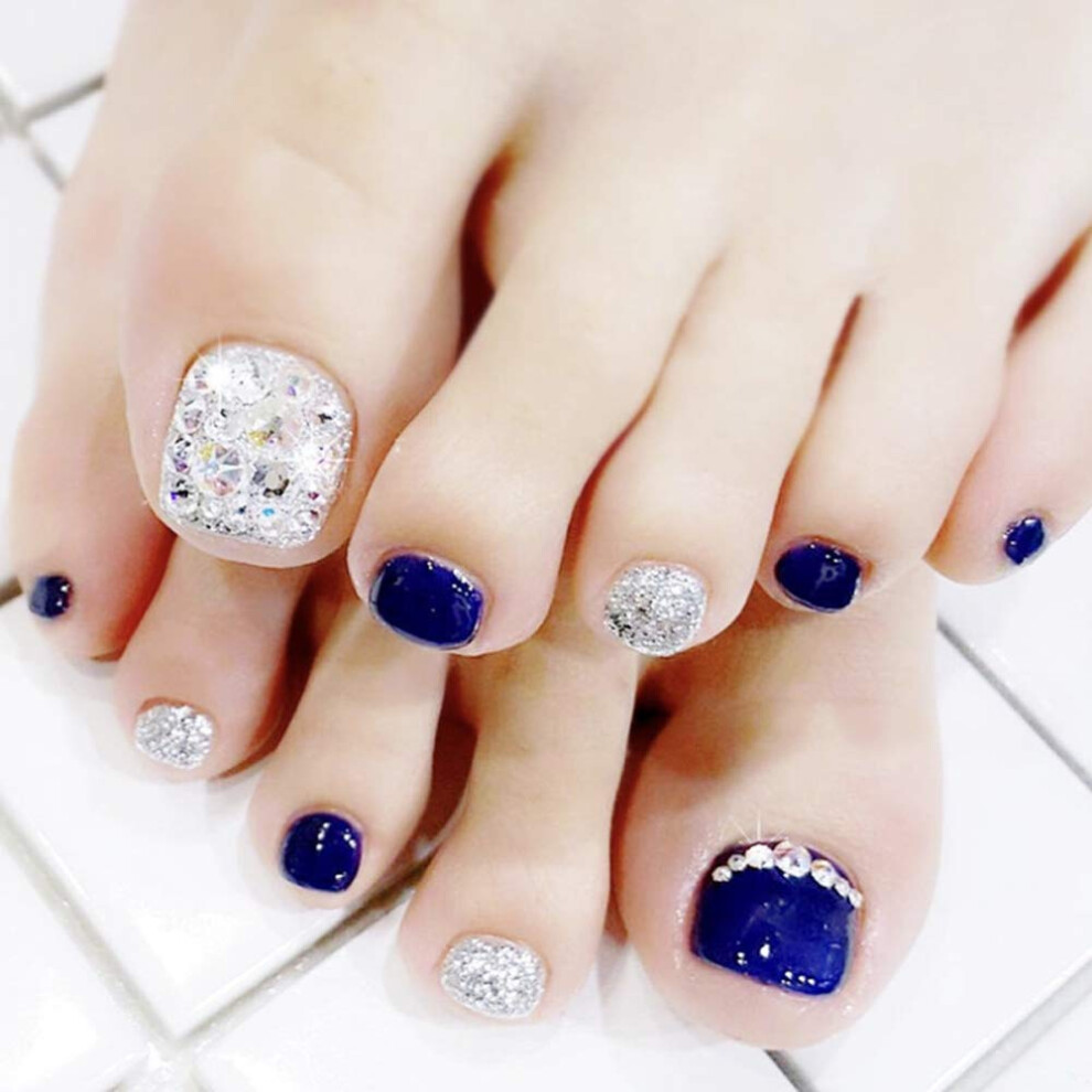 Press-On Nails, Luxury Glitter Blue Silver Glitter Acrylic False Toe Nails With Rhinestone Design For Women Menicure, Full Cover Toe Nail Art, 24Pcs
