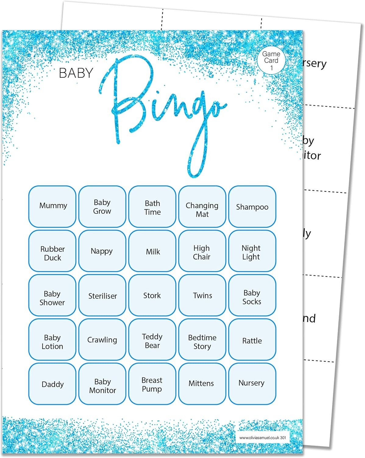 Olivia Samuel 16 Player Bingo Baby Shower Game - Blue Glitter Effect Design (16 Guest Cards + 4 Sheets of Calling Cards for The Host + Winner's Certificate)