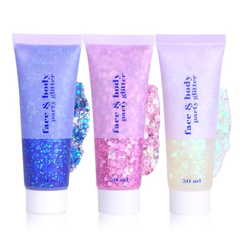 Sularpek 3 Pcs Face Glitter, 50ml Hair Glitter Gel, Sequins Shimmer Liquid Eyeshadow, Mermaid Sequins Festival Glitter for Face Body Eye Hair Festival Party Makeup Decoration