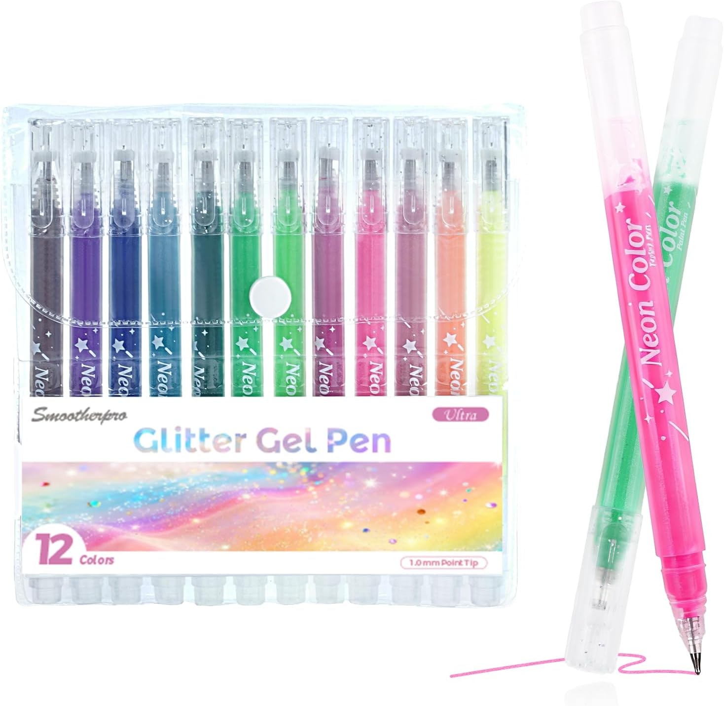 Glitter Pens, Glitter Gel Pens Set 12 Colors, 1.0mm Tip Smooth Writing, Non-Per