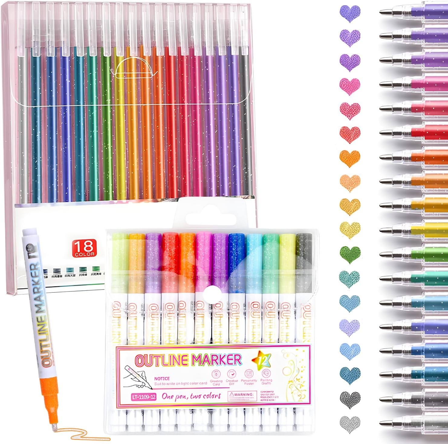 36 Pack Glitter Gel Pens Set, 24 Sparkle Gel Pens 12 Glitter Outline Pens in Ca