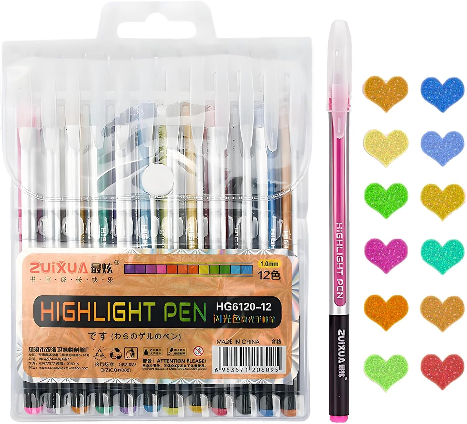 12Pcs Gel Pens, 12 Colours Glitter Gel Pens, Glitter Pen for Kids Adult Writing