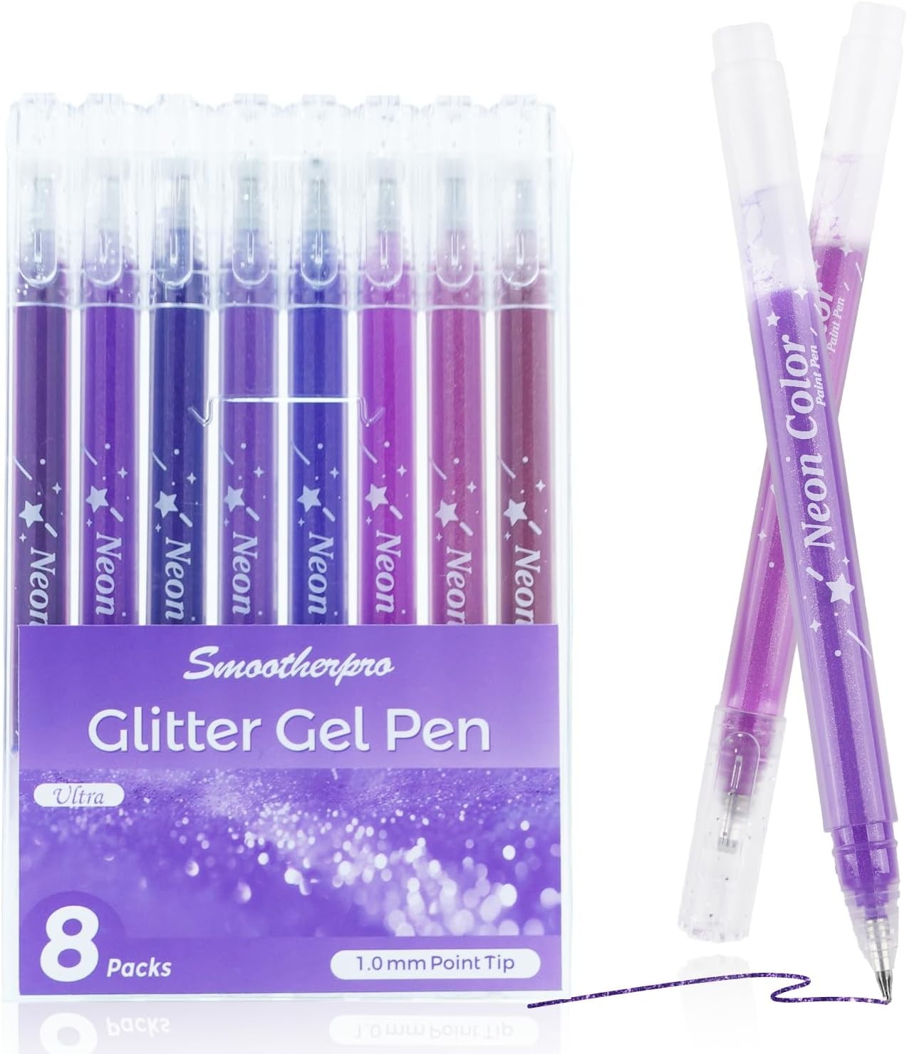SMOOTHERPRO Metallic Glitter Gel Pens | Pack of 8 | 1.0 mm Tip Purple Glitter S