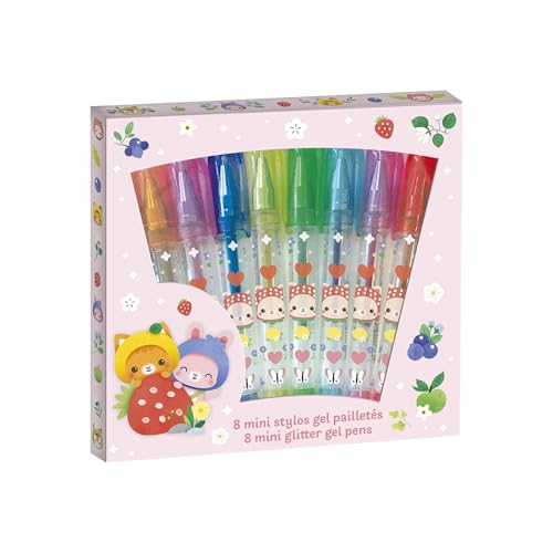 Janod - 8 Mini Glitter Gel Pens - Rainbow Colours - Compact Size - For Writing in Secret Notebooks, Diaries or Drawings - Ages 6 and up