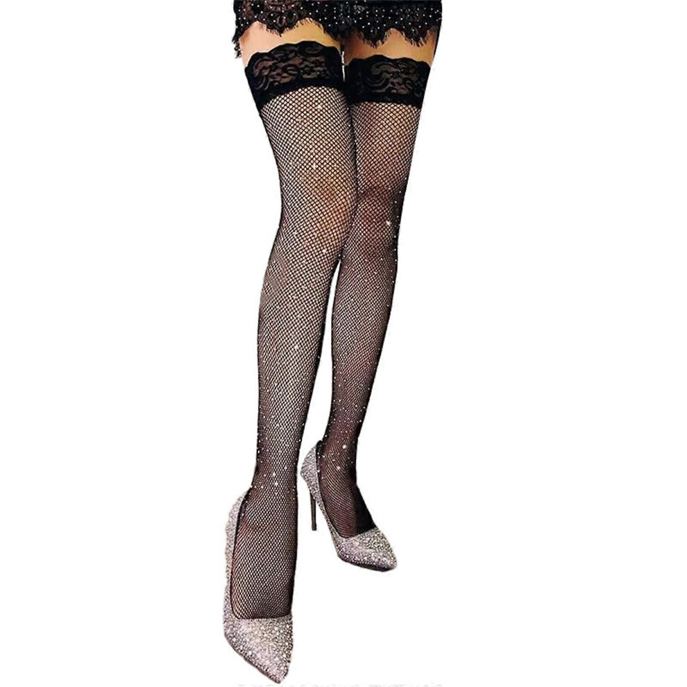 (As show, One size) Women Fishnets Thigh High Stockings with Lace Top Sheer Mesh Glitter Rhinestone Over Knee Long Socks for Nightclub Party Black
