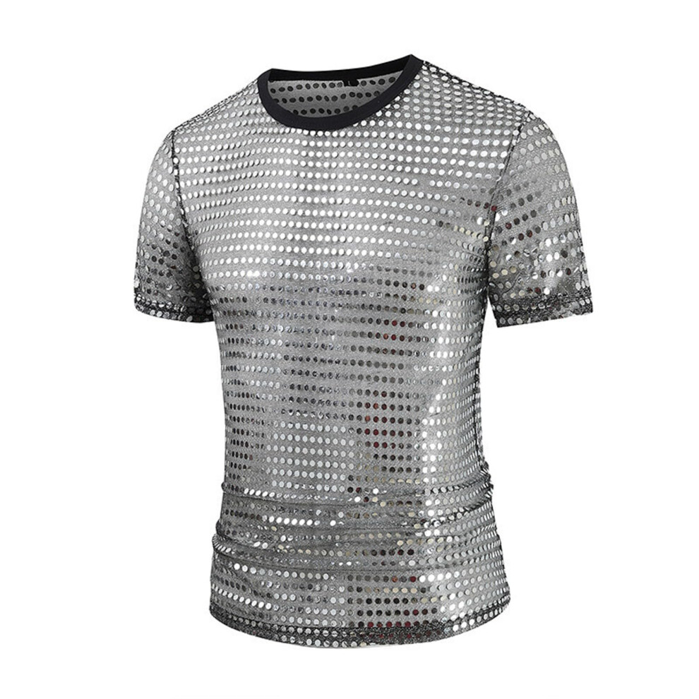 Men's Glitter T-Shirt Sequins Shirt Metallic Mesh Top Casual Disco Party Costume Breathable Comfortable 3XL Silver
