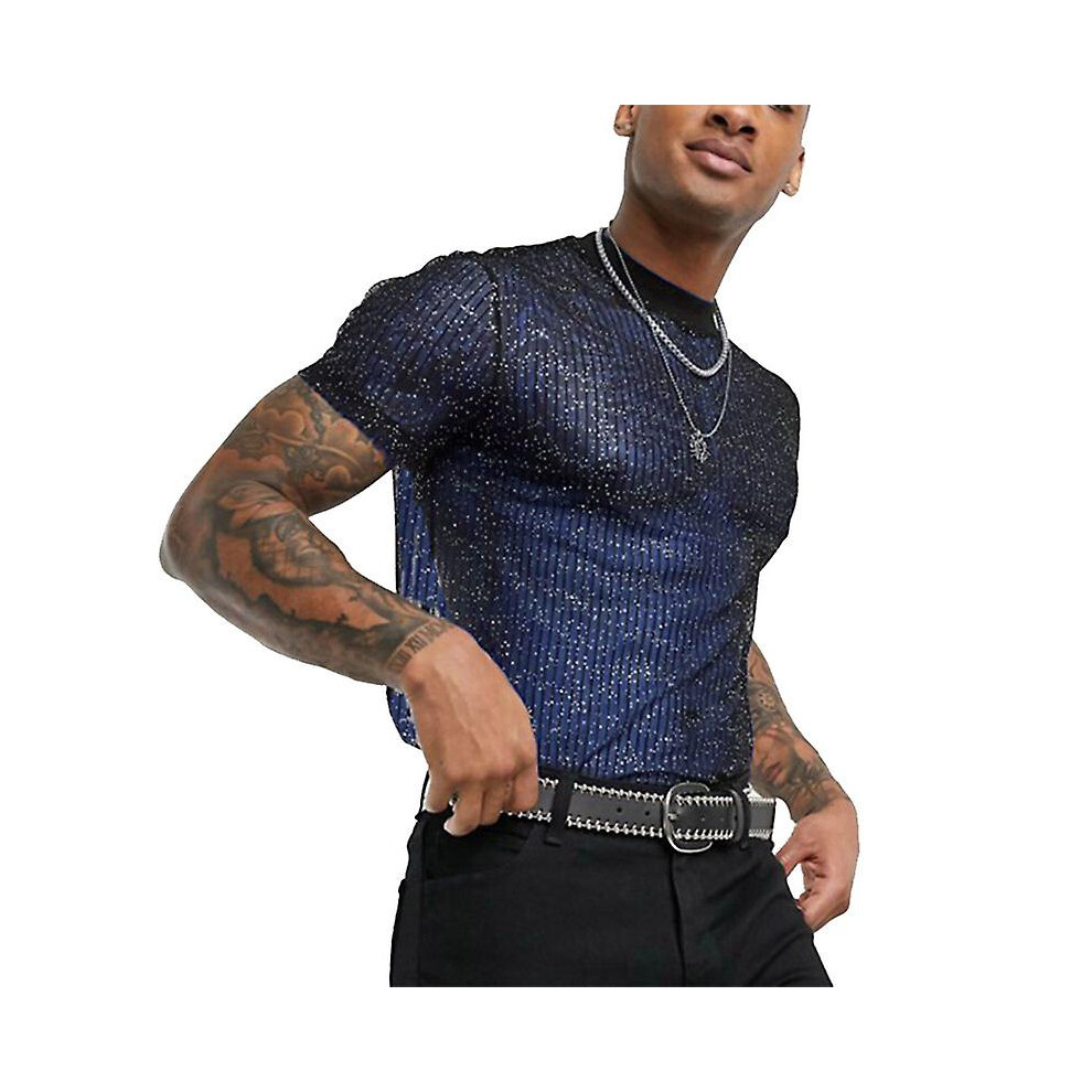 (Blue, XL) Men's Sheer Mesh Short Sleeve Shirt, Glitter Crew Neck Top