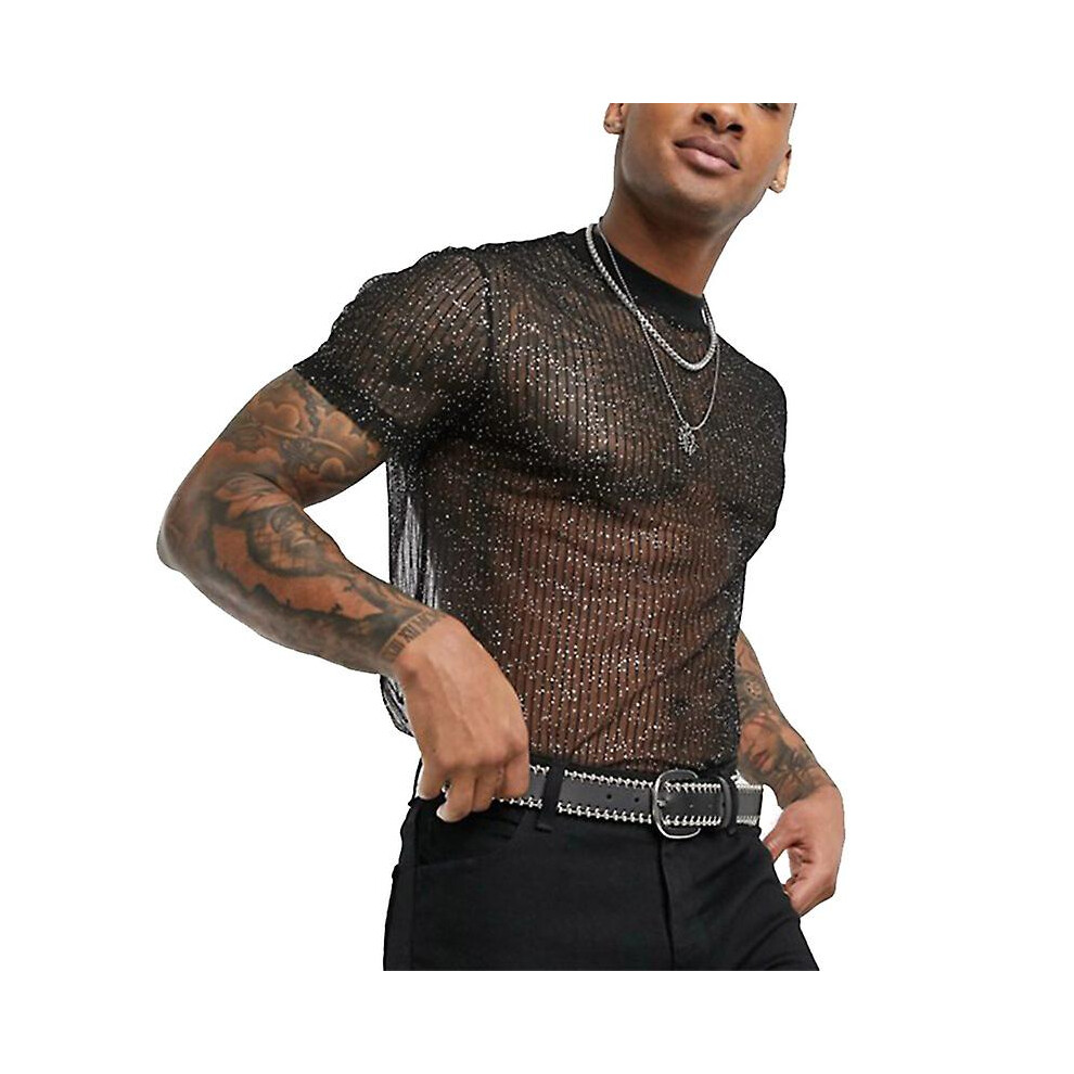 (Black, L) Men's Sheer Mesh Short Sleeve Shirt, Glitter Crew Neck Top