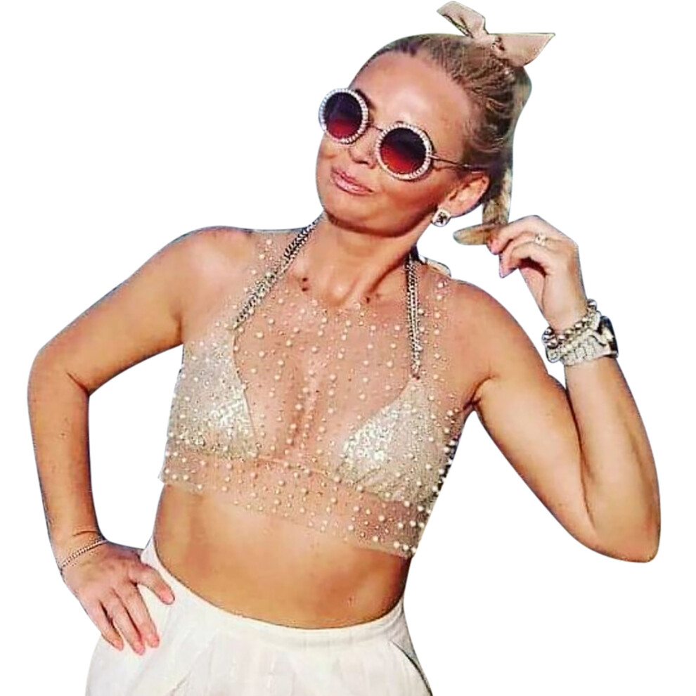 Top Sequins Women's Long Blouse - Elegant Festive Mesh Glitter Shirt in Gold, Large Size 190 for Carnival Events