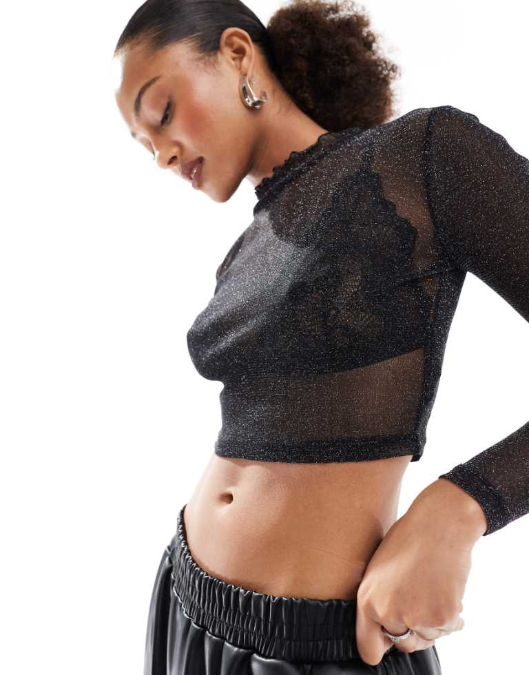 JJXX Womens long sleeve mesh top in black glitter - Size Small