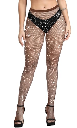 Forevers Womens Fishnet Tights Glitter Fishnets Diamond Halloween Tight Rhinestone Pantyhose Sparkly Socks, Coffee