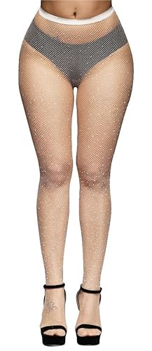 DUCMODA Women's Sparkly Fishnet Stockings Rhinestone High Waist Tights Glitter Party Concert Pantyhose-White