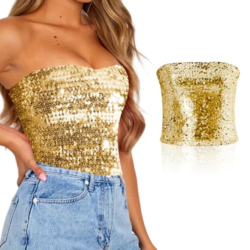 UILYNIU Glitter Women's Sequin Tube Top, Sparkly Gold Strapless Crop Tops, Stretchy Sleeveless Bandeau Chest Wrap Top for Party Clubwear (UK, Alpha, M, L, Regular, Regular, Gold)