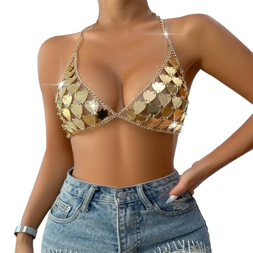 IYOU Glitter Metal Body Chain Sequin Vest Crop Tops Deep V Chain Halter Backless Top Nightclub Party Body Harness Accessories for Women (Silver)
