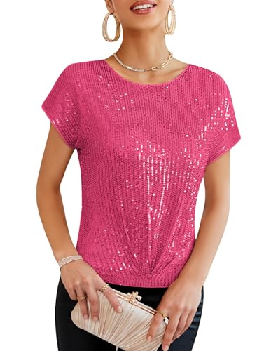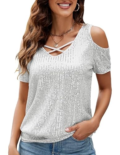 Glitter & Sequin Tops for Women - Cross & V-Neck, Cold Shoulder, Evening & Festival Outfits - Sparkle Short Sleeve Dressy Blouses for Club Party