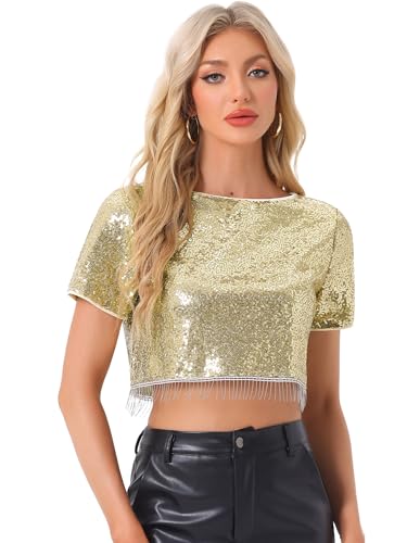Allegra K Sequin Tops for Women Christmas Costumes Glitter Short Sleeve Cropped Round Neck Tassel Cocktail Party Dressy Blouses Sparkly Top Champagne Gold S