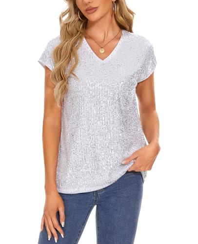 MINTLIMIT Women's Sequin Tops for Party Evening Glitter Sparkly Short Sleeve Blouse V Neck Tops (Silvery L)