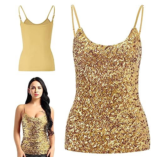 Women's Sequin Tops, Sleeveless Glitter Camisole Vest, Adjustable Straps Daily Halter Tank Tops Blouse Tshirts for Night Club Party Performance Costume Gold