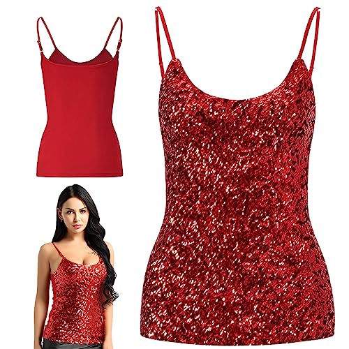 Women's Sequin Tops, Sleeveless Glitter Camisole Vest, Adjustable Straps Daily Halter Tank Tops Blouse Tshirts for Night Club Party Performance Costume Red