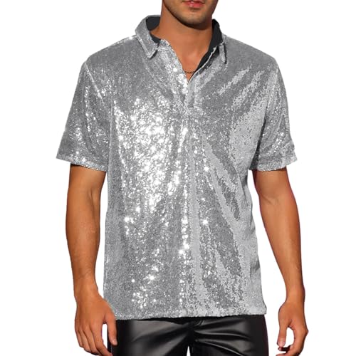 Caziffer Men's Disco Sparkle Sequins Shirt Retro Glitter Party Club Night Out Shiny Stylish Vintage Statement Costume Casual 1/4 Button Short Sleeve Tops for Vacation Streetwear (Silver, L)