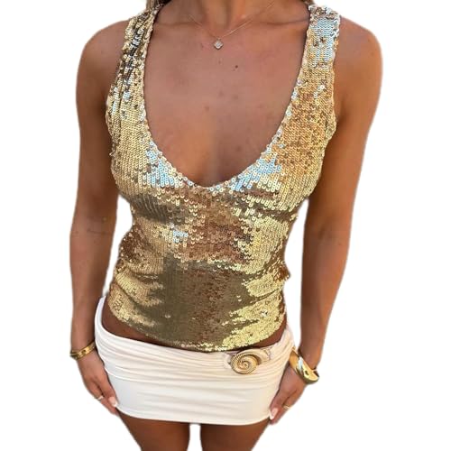 Nicoxijia Sequin Tank Tops for Women Sparkle Glitter Sleeveless Party Club Crop Top Sexy Concert Disco Going Out Cami Vest (Gold, M)