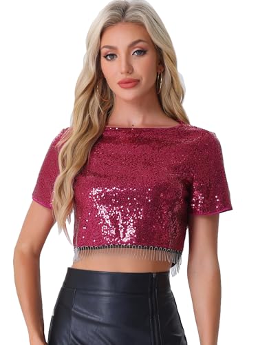 Allegra K Sequin Tops for Women Glitter Short Sleeve Cropped Round Neck Tassel Cocktail Party Dressy Blouses Sparkly Top Dark Rose M