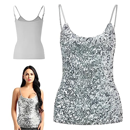 Women's Sequin Tops, Sleeveless Glitter Camisole Vest, Adjustable Straps Daily Halter Tank Tops Blouse Tshirts for Night Club Party Performance Costume Silver