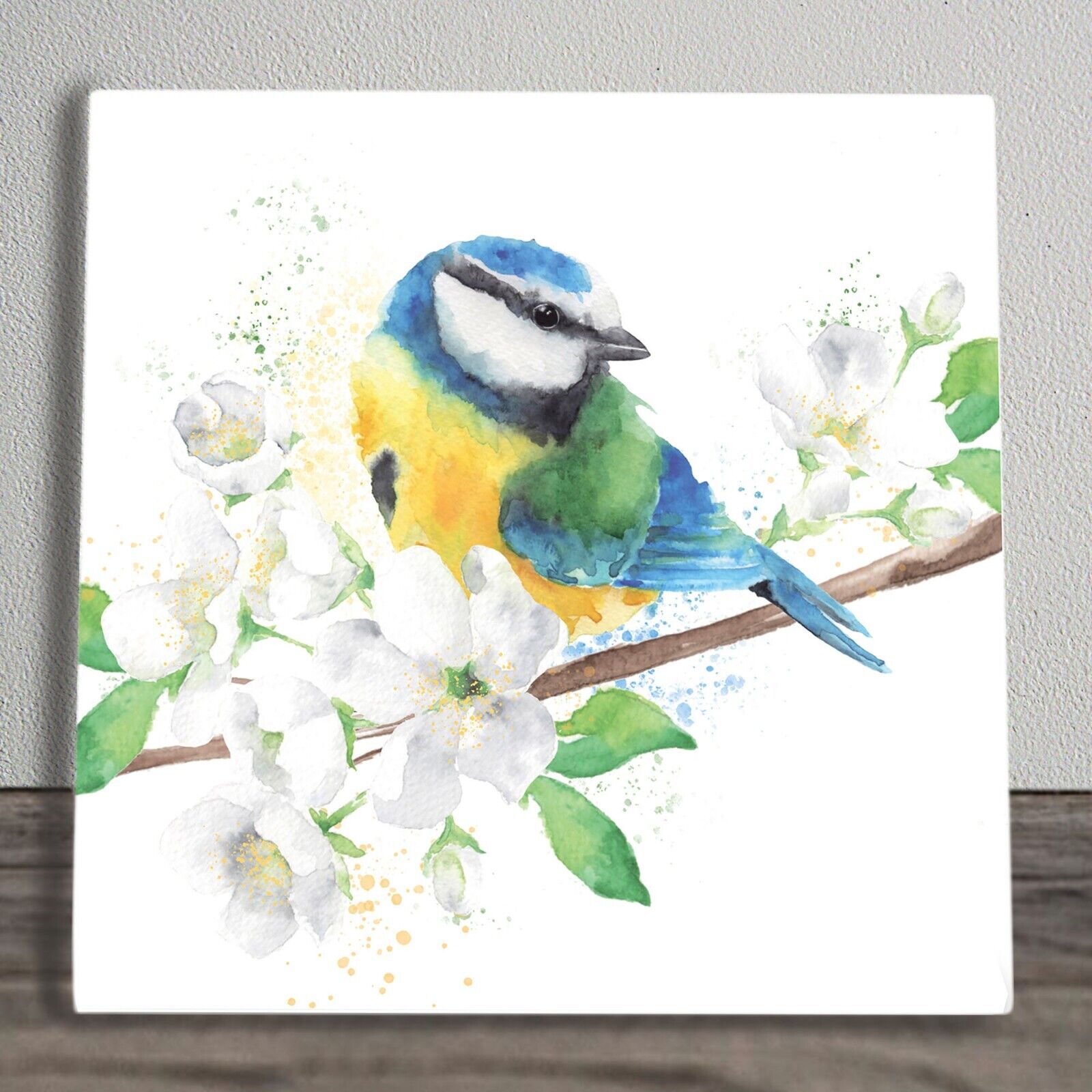 Blue Tit & Blossom Ceramic Tile Picture Plaque Sign Wall Art K T Bentley 20x20cm