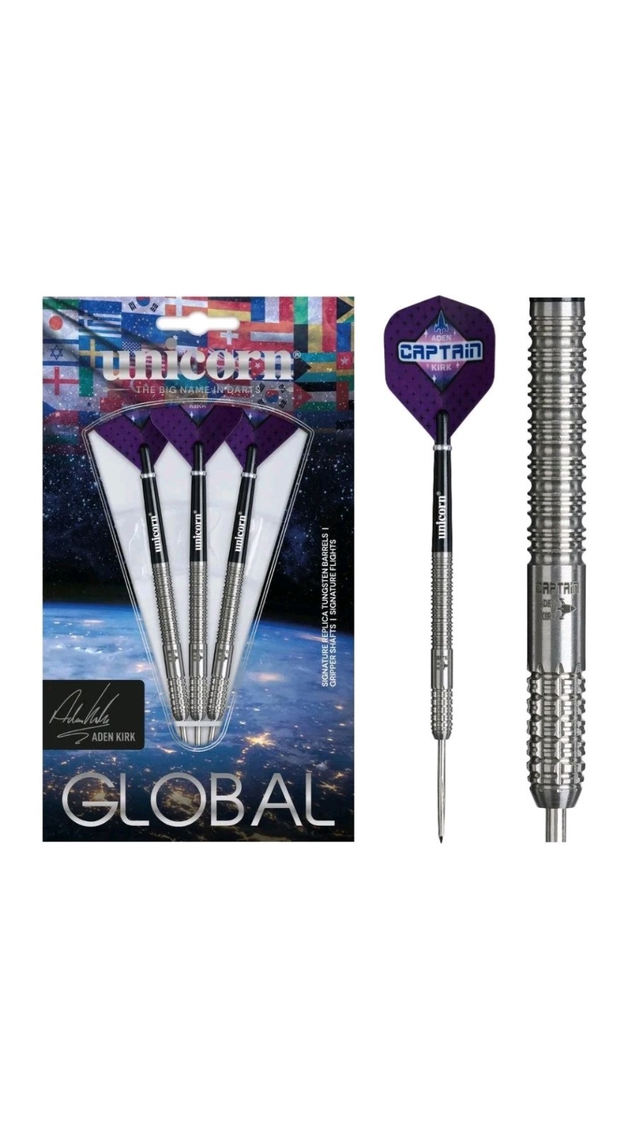 Unicorn | Aden Kirk | Global | 90% Tungsten Parellel Barrels with Concentric Grip Rings | Steel Tip Darts Set | Captain | Nickel Volute Points | 22 g