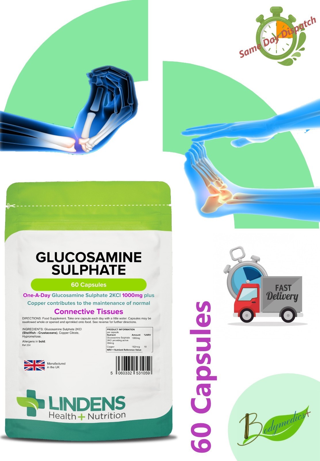 Glucosamine Sulphate 1000mg (60 Capsule) for Normal Connective Tissue LINDENS UK